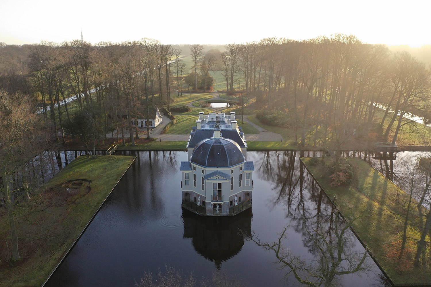 Om te beginnen wordt een deel van het huidige grasveld uitgegraven, zodat het huis, net als vroeger, weer helemaal in het water ligt. Ook worden de vier eilanden teruggebracht en wordt op de binnenste eilanden een haag geplant. Deze haag geeft de eilanden het ‘geheime’ karakter uit de tijd van Tromp terug.